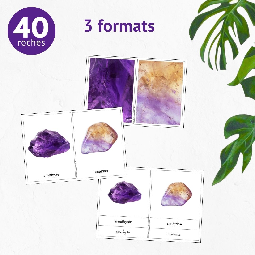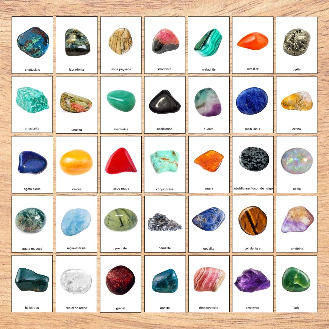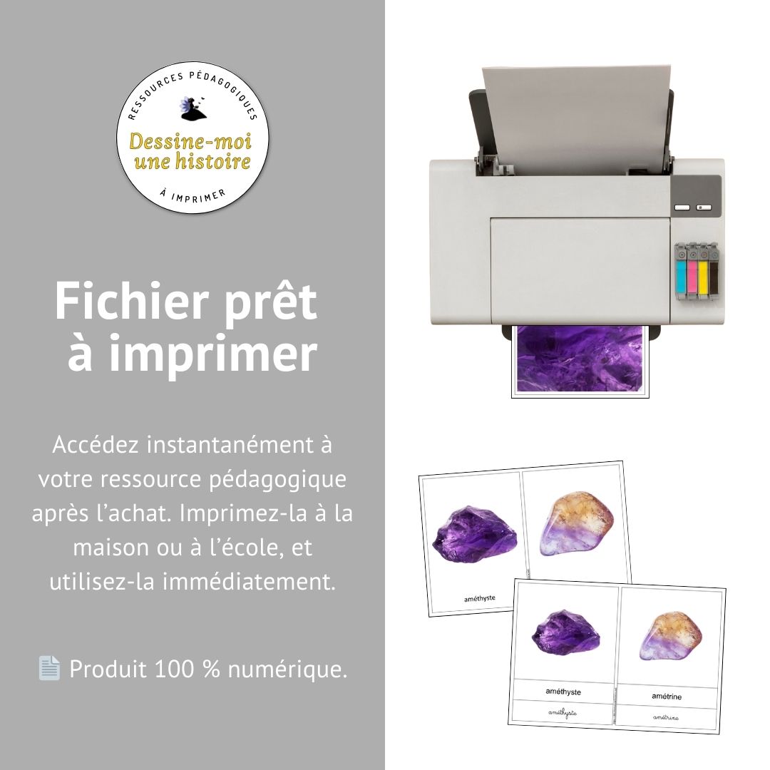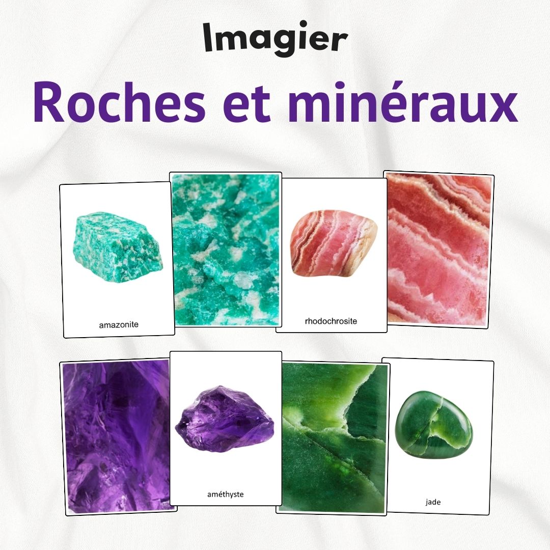 Matériel nécessaire : ce fichier, une imprimante, du papier, une plastifieuse (optionnel pour la durabilité), des ciseaux, de véritables roches ou minéraux si possible, plateau ou tapis pour la présentation