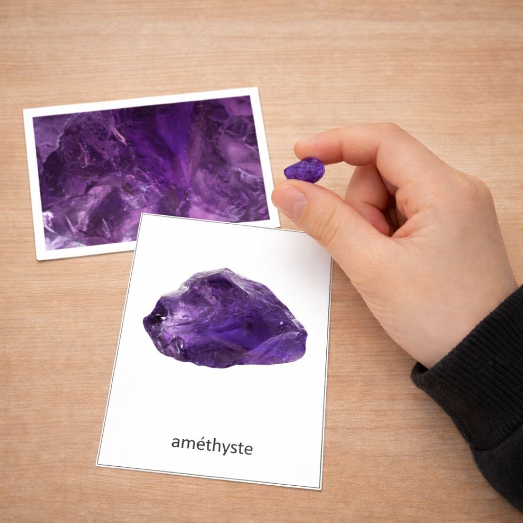 • Associer image et objet réel : Si vous disposez de véritables échantillons de roches, invitez l’enfant à placer la pierre sur la carte correspondante.